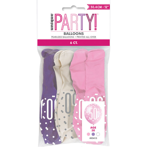 50 Birthday Glitz Pink, Lavender and White Balloons x 6