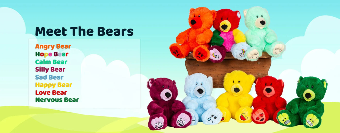 Young and old have benefitted from ownership of these unique and specialised Mood Bears. All eight Mood Bears have a distinctive colour to match the mood associated with their name, based on colour psychology, and each has paw shapes indicating the mood they depict. Each is designed to illustrate and reflect one of eight important human emotions.