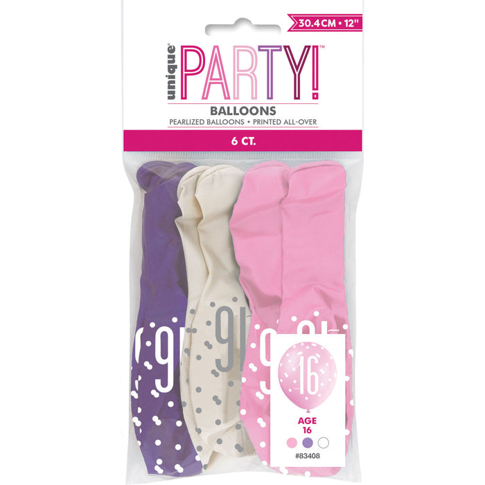 16 Birthday Glitz Pink, Lavender and White Balloons x 6