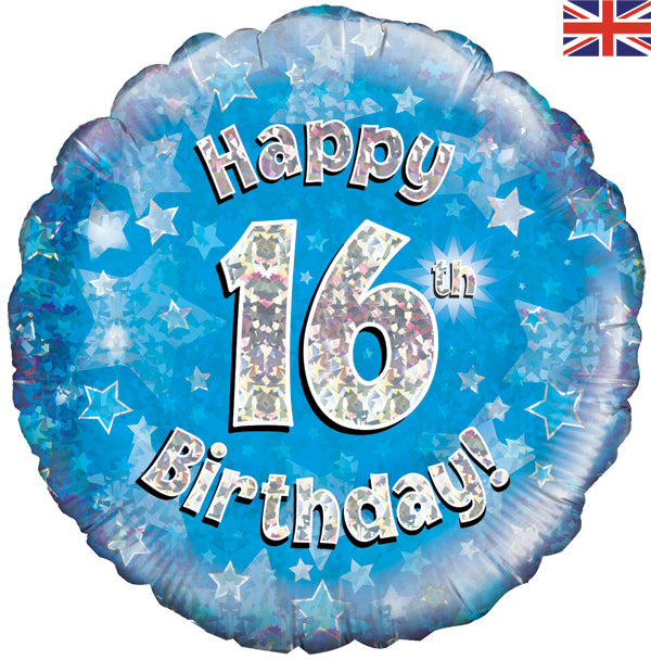 Happy 16th Birthday Blue Holographic 18" Balloon (Optional Helium Inflation)
