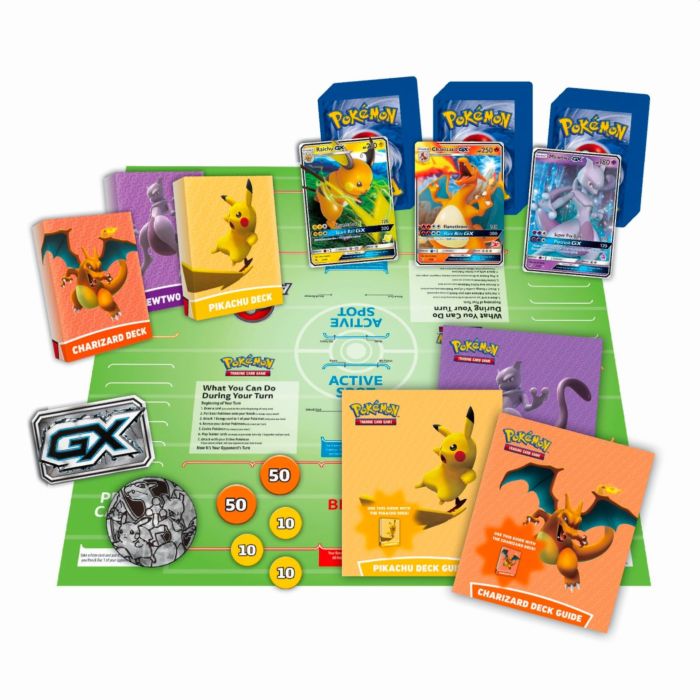 Prepare for a Pokémon battle with the ready-to-play Pokémon Trading Card Game Battle Academy! The Battle Academy includes everything two players need to play, with guides to the decks so your first game is easy to follow. You can choose Charizard or Pikachu to lead your team in a heads-up battle against another Trainer. Then, switch up the decks to play Mewtwo against Charizard or Pikachu, and lead a different team of Pokémon into the arena! With a little strategy and a little luck, you can battle with the best!
